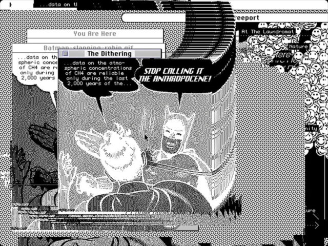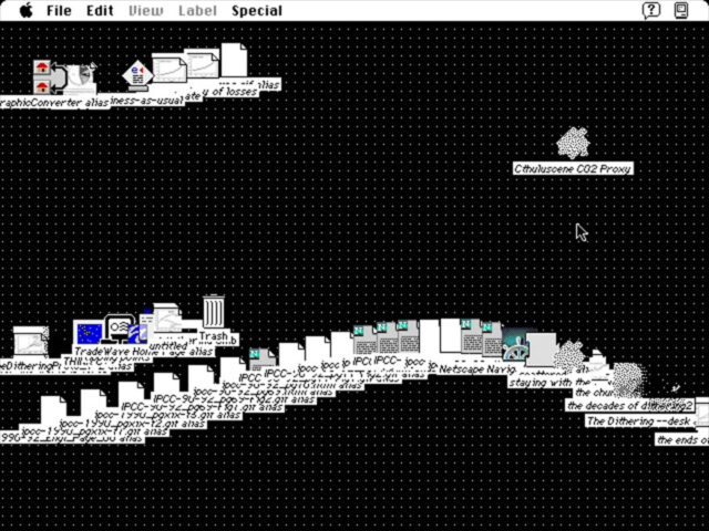The title, The Dithering, has a double meaning. There is the familiar technical meaning given by the famous Atkinson dithering algorithm, originally developed by Apple, to display images on the early 1-bit monochrome Mac. The series borrows another meaning, coined by sci-fi author Kim Stanley Robinson in the novel 2312, which historicizes the early 21st century’s tragically inadequate response to the climate crisis as the “decades of dithering”. By situating 90s climate science on the desktop of a popular computer from the same time period, it becomes more visceral how many years have been spent dithering on it.