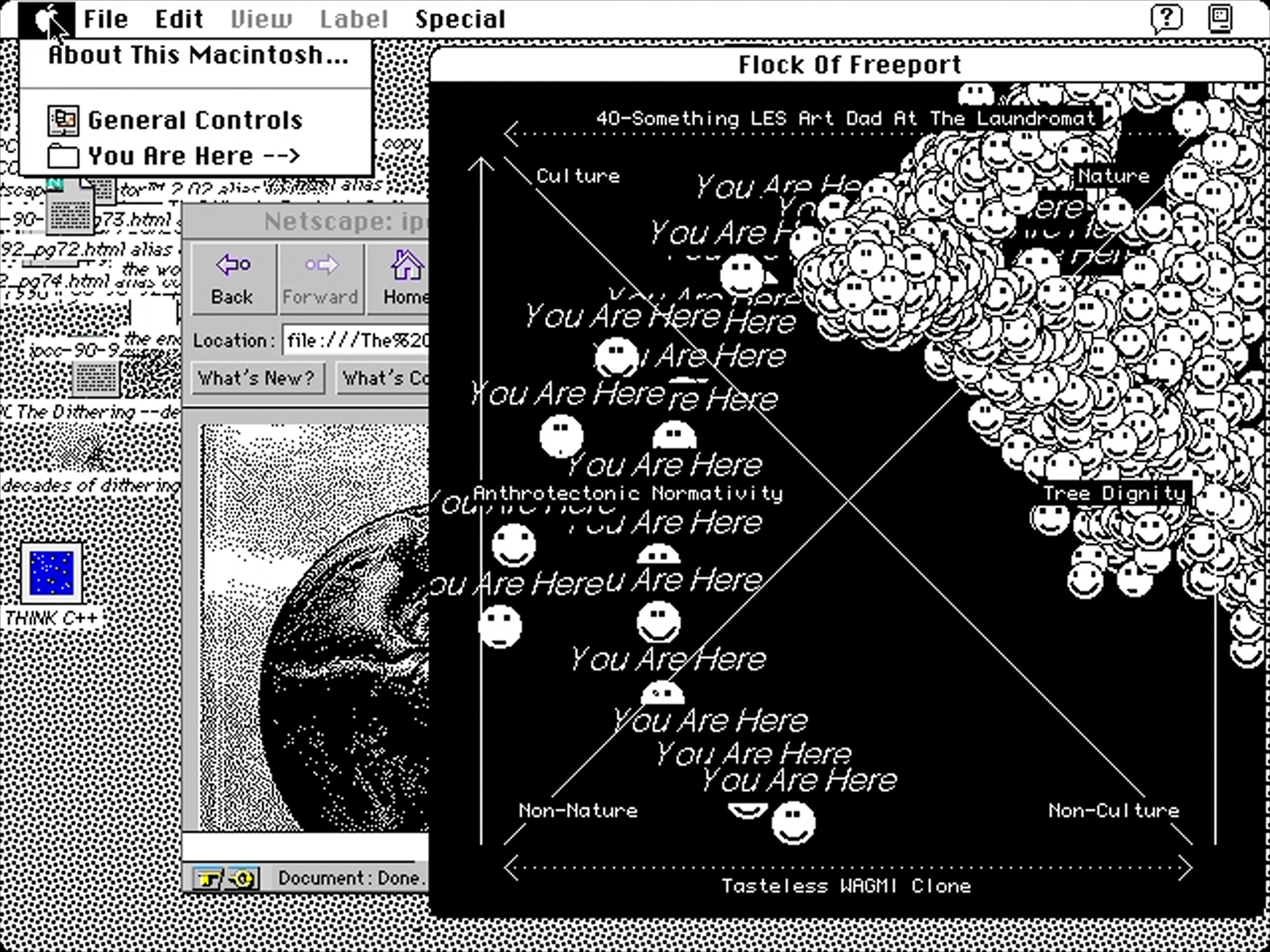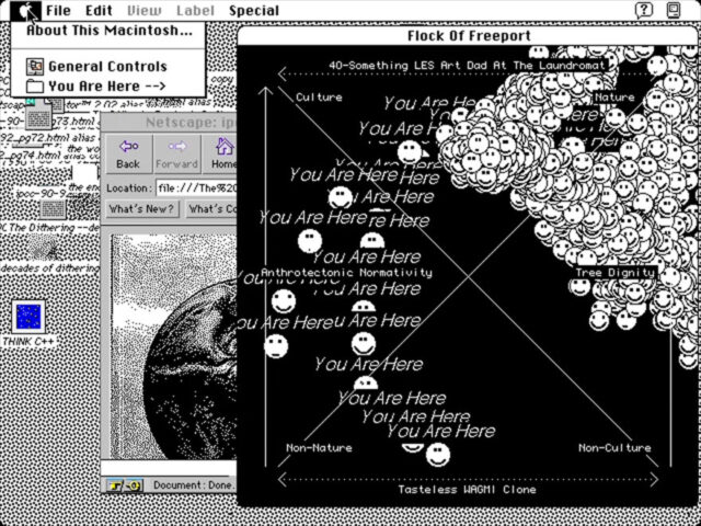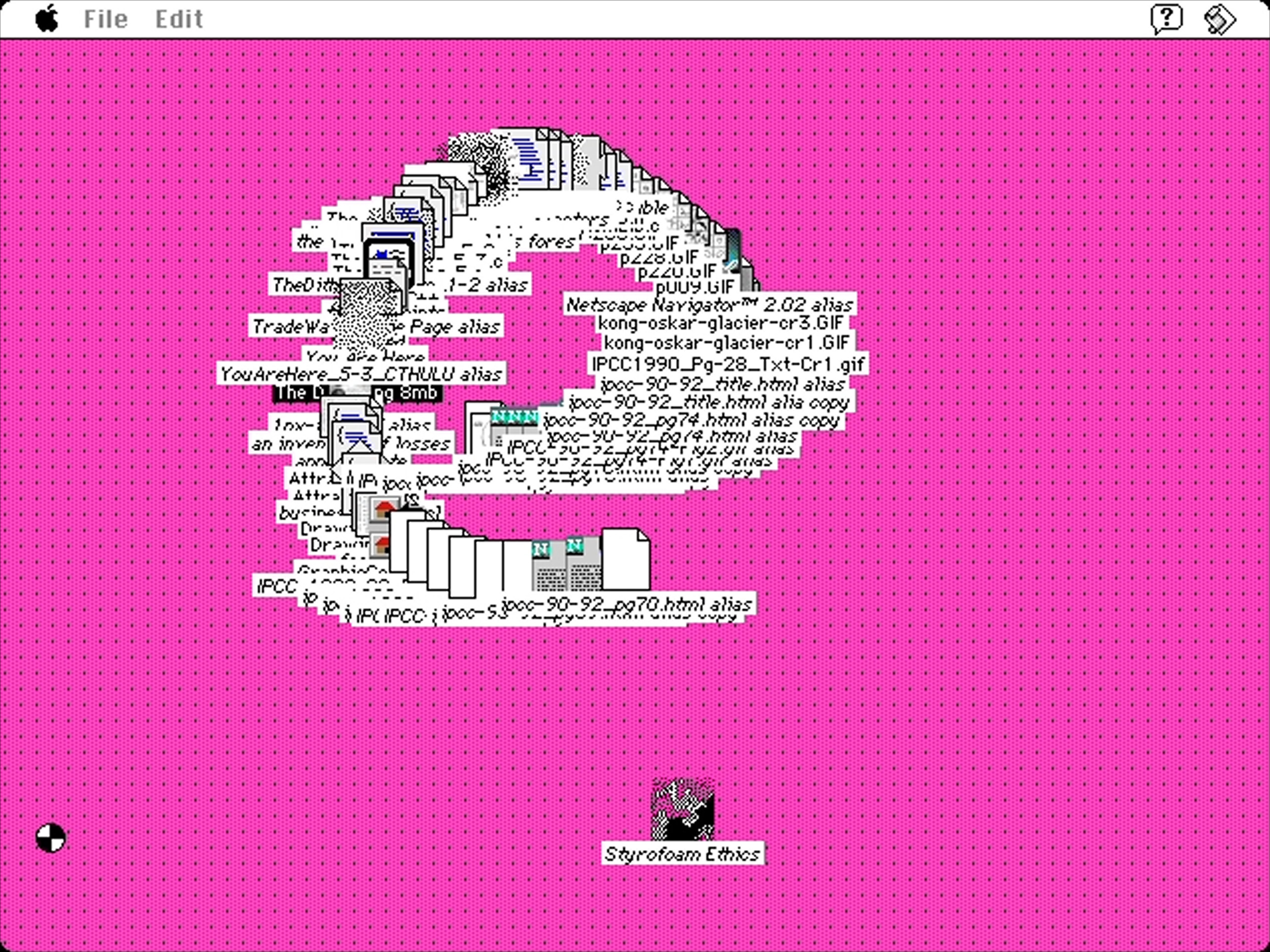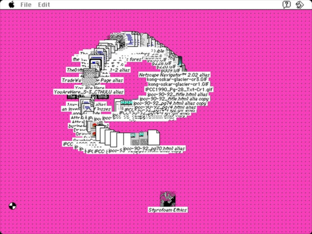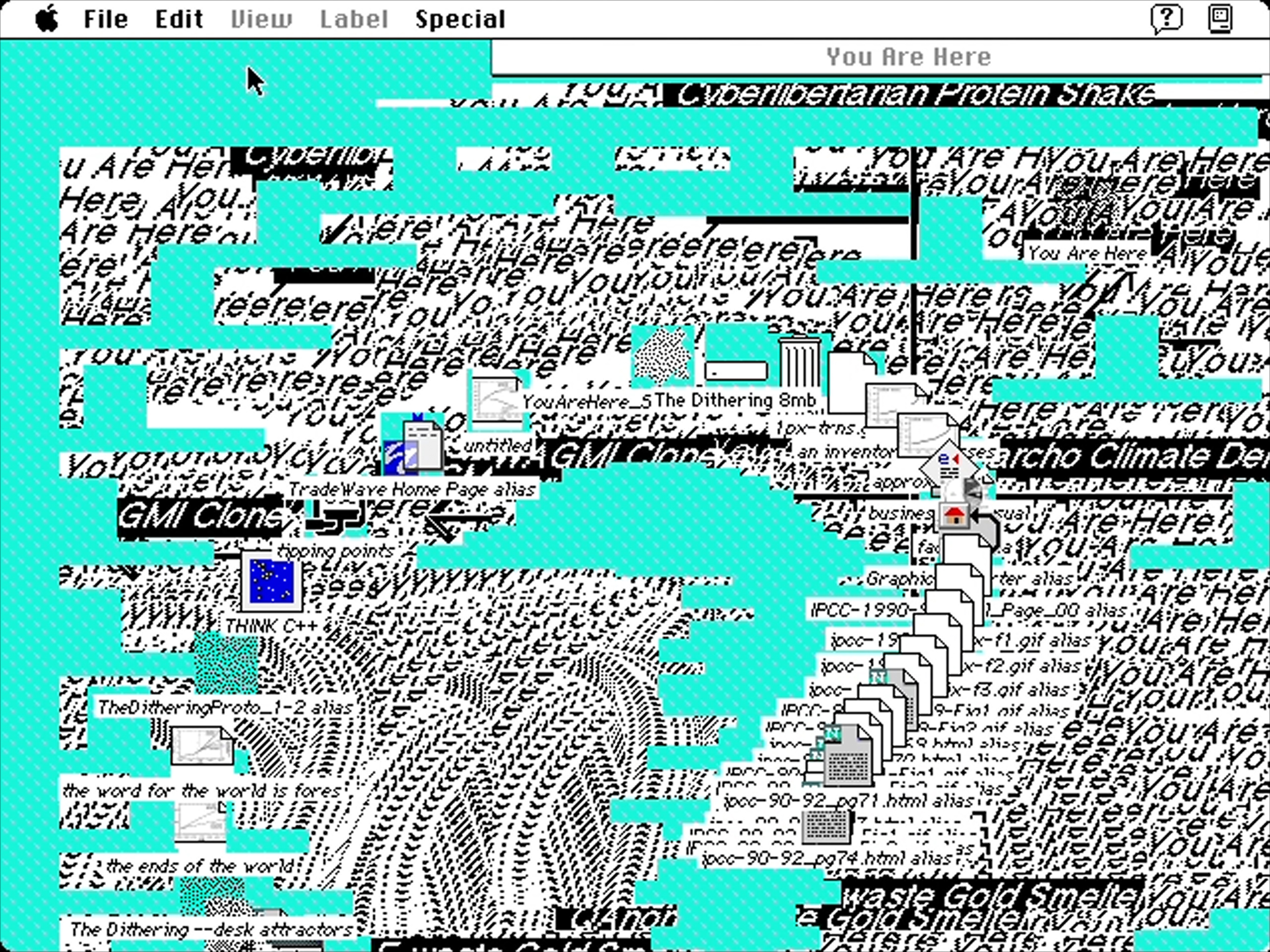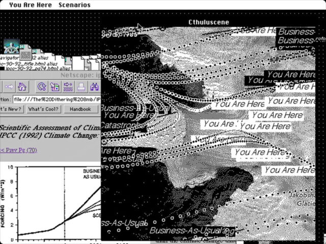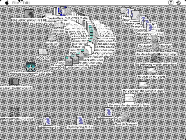 The Dithering was first developed as a browser emulation of a Macintosh II with System 7.1; Generative AppleScript code traces a strange attractor on the desktop with the file icons; Custom applications written in C plots generative compositions using strange attractor models, semiotic diagrams, textual excerpts and images of Greenland glacier collapse; Images and text from the 1990 IPCC Climate Assessment report are reproduced in HTML 1.0 and viewed in Netscape; Miscellaneous digital artifacts from 1980s to present.