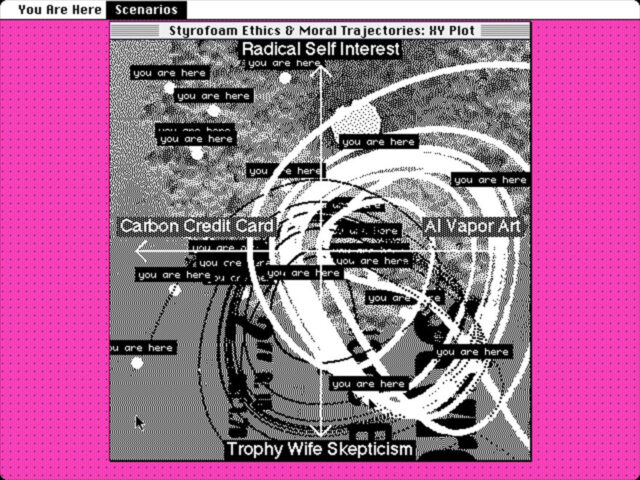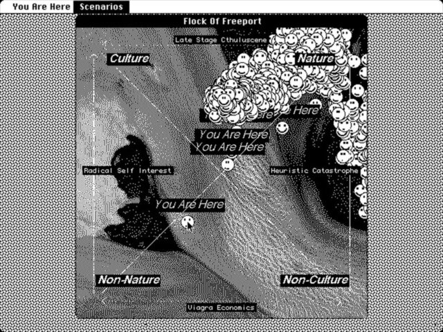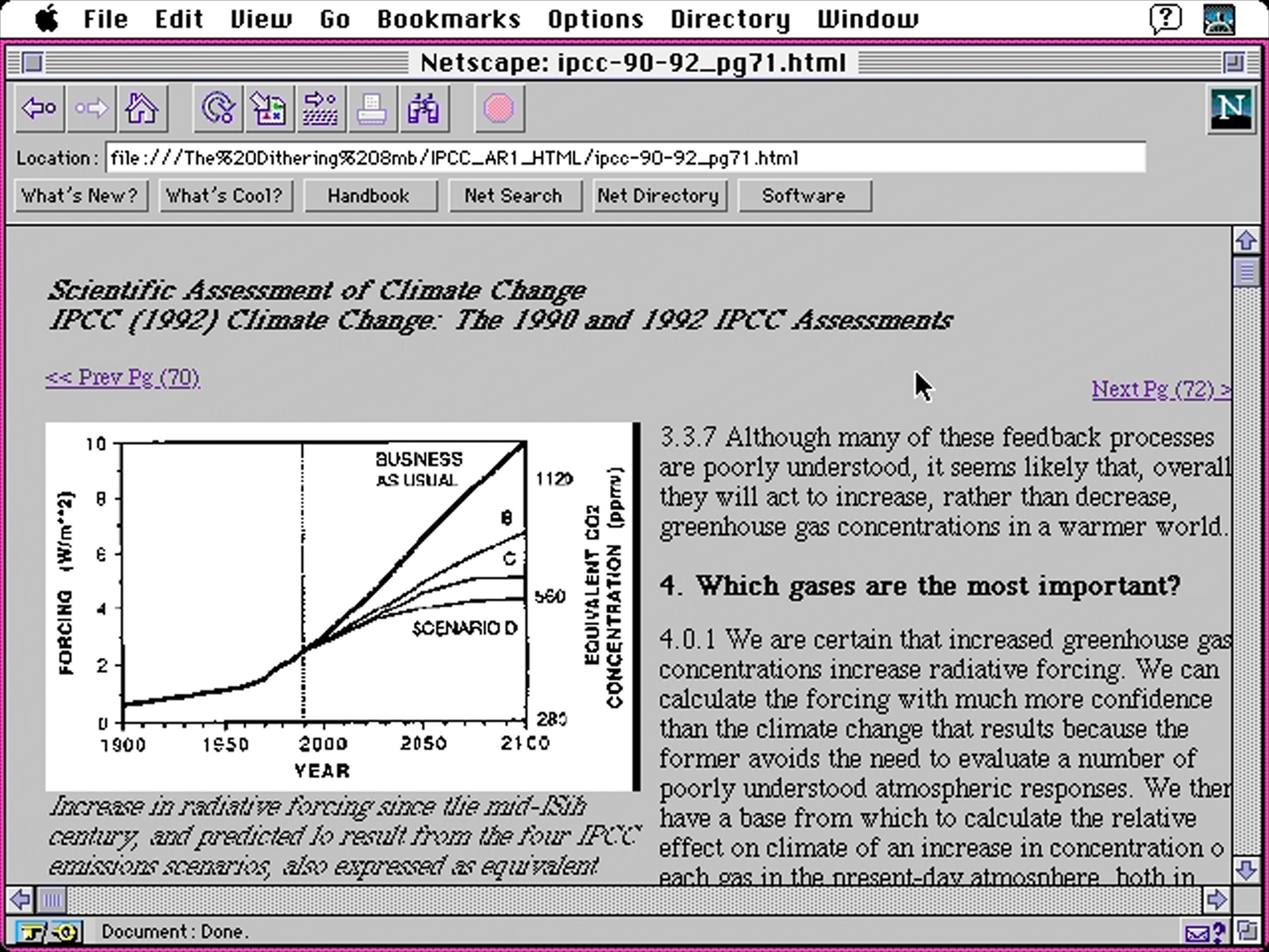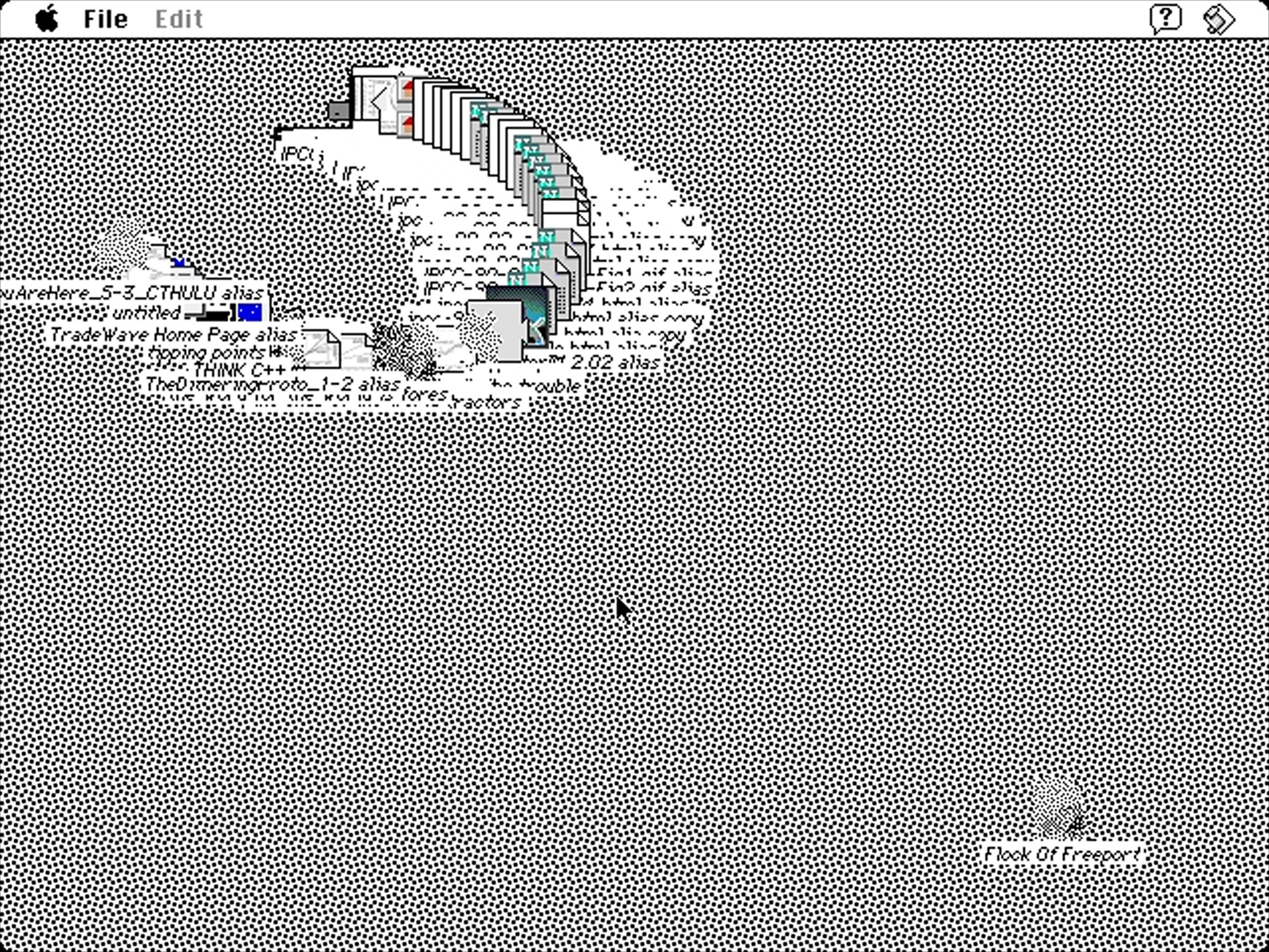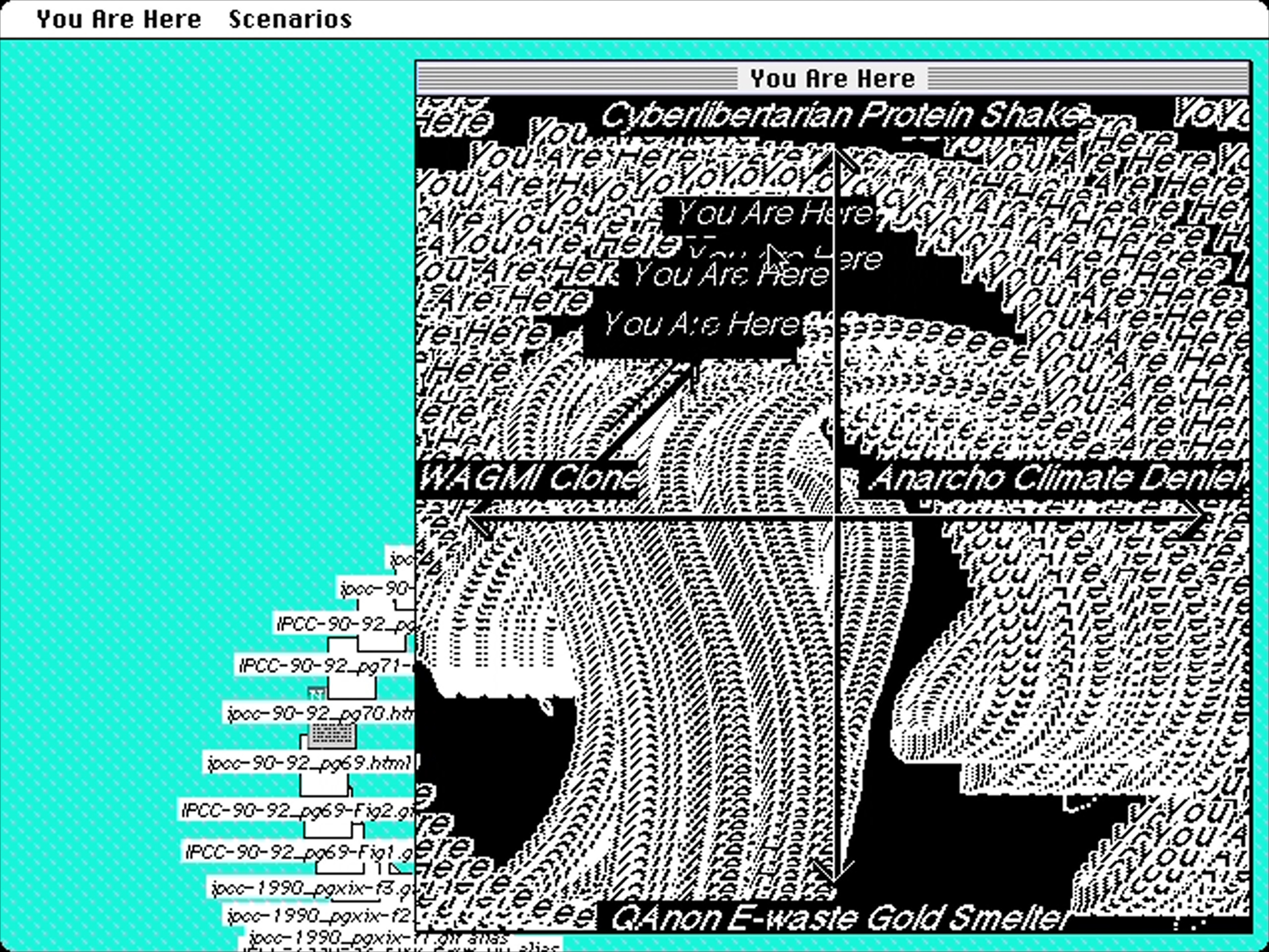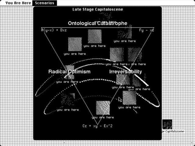 The Dithering was first developed as a browser emulation of a Macintosh II with System 7.1; Generative AppleScript code traces a strange attractor on the desktop with the file icons; Custom applications written in C plots generative compositions using strange attractor models, semiotic diagrams, textual excerpts and images of Greenland glacier collapse; Images and text from the 1990 IPCC Climate Assessment report are reproduced in HTML 1.0 and viewed in Netscape; Miscellaneous digital artifacts from 1980s to present.