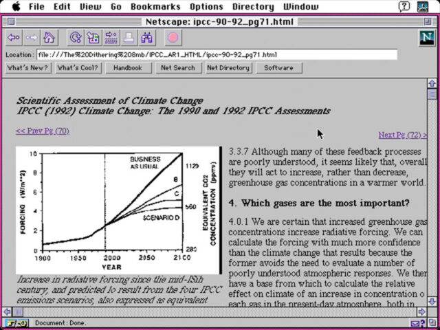 The interactive works include an exploration of the first IPCC Assessment Report, published in 1990, whose pages have been reconstructed in HTML 1.0 and may be viewed in an early browser. The various software artworks plot strange attractor models, satellite imagery, and text that articulate ethical quandaries at the intersection of technology and climate.